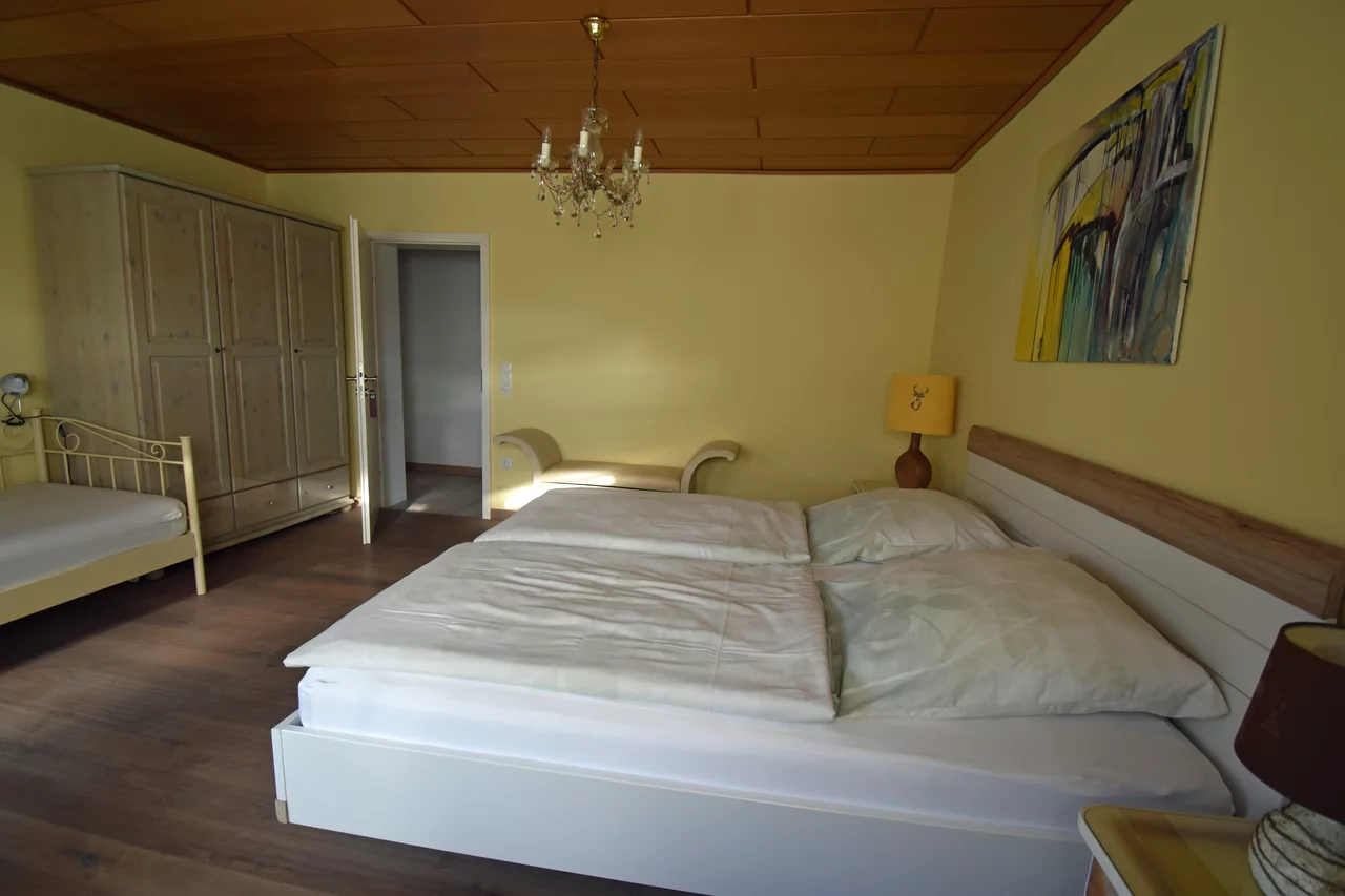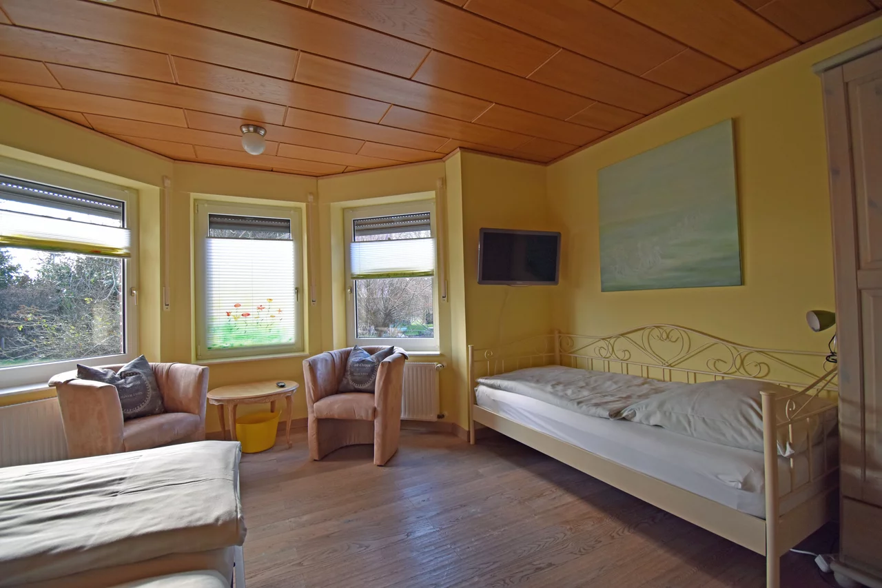 Urlauber erwartet eine geräumige, liebevoll eingerichtete Ferienwohnung mit drei Schlafzimmern, Kaminzimmer, eigener Terrasse und Garten – ideal für entspannte Stunden im Grünen. Auf dem Hof selbst gibt es viel zu entdecken: Besuchen Sie unseren Färbergarten, stöbern Sie in der Landgalerie oder werfen Sie einen Blick ins Atelier buyArt, wo sich die Künstlerin Silke Noltenhans austobt.